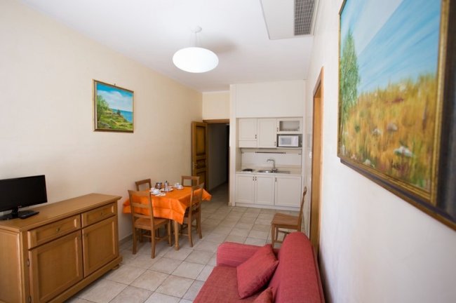 bilocale in muratura; primo piano; aria condizionata; area giorno con angolo cottura (due piastre elettriche); frigo; tv-LCD; 1 camera con letto matrimoniale; divano letto doppio in area giorno; bagno con cabina doccia idromassaggio e bidet. Balcone.